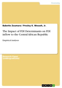 Research Paper (undergraduate) from the year 2012 in the subject Economics - Other, , language: English, abstract: With Autoregressive Distributed Lag (ARDL) bound test technique to cointegration and Error Correction Model (ECM), the impact of FDI determinants on FDI to the Central African Republic (CAR) from 1965 to 2010 was empirically examined. Results show that all regressors were of the order of one [I (1)] except inflation rate [I (0)], with stable cointegrating relationship with FDI. Additionally, diagnostic tests proved that the model was correctly specified and reliable; with FDI inflow statistically and positively correlating with market size, inflation and corruption but negatively with openness to trade and political instability. Political instability had strongest negative impact; implying that FDI responds to political instability in CAR more than the rest of the explanatory variables. Therefore, in order to attract the required FDI, the security situation in the country needs to be improved and efforts must be directed towards improving the economic performance of the country by diversifying its economic activities and encouraging private participation. Furthermore, CAR needs to secure its borders by cooperating with its neighbours on possible joint border patrols. For long term policy intervention, good governance and its attendant conditions (rule of law, transparency, accountability, respect for human rights and equal opportunities) and institutions (strong and independent judiciary, opposition, media, electoral commission, security force and public services) must be pursued. Most importantly, higher education must be prioritized and implemented to foster national unity, reduce crime and conflicts, and provide employment, better salaries, and vibrant domestic economic activities to generate revenue for rapid and sustained economic development.