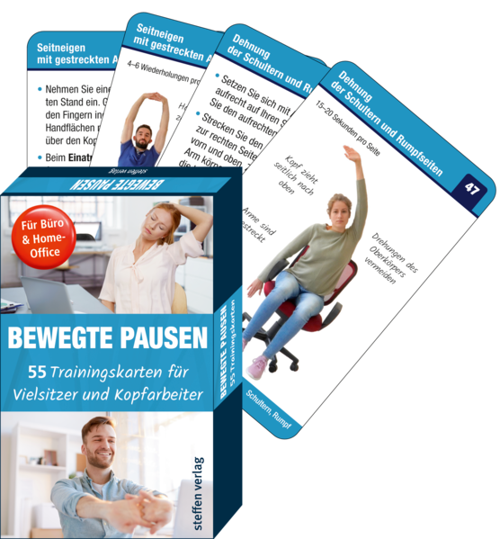 Dabei genügen Mini-Bewegungspausen im Arbeitsalltag, um mit einfachen Übungen Verspannungen und Schmerzen in Schultern, Nacken und Rücken sowie im Hüftbereich zu lindern und vorzubeugen. Mit den Trainingskarten "Bewegte Pausen - Fit im Büro & Home-Office" können Sie jederzeit am Schreibtisch eine aktive Pause einlegen - im Stehen oder Sitzen und einfach in Büro- und Alltagskleidung.