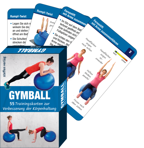 Die Übungen im Trainingskarten-Set "Gymball" sind für alle Altersgruppen und für Anfänger und Profis gleichermaßen geeignet. Suchen Sie sich einfach die für Sie passenden Übungen heraus oder nutzen Sie die Workout-Vorschläge. Den Schwierigkeitsgrad passen Sie Ihrer körperlichen Fitness an. Jede Karte enthält Übungshinweise auf der Vorderseite und eine ausführliche Übungsbeschreibung auf der Rückseite.