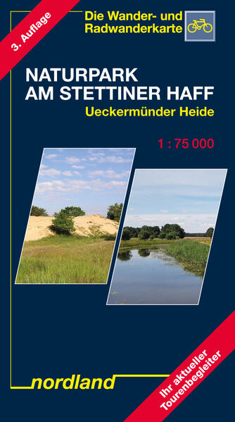 Urlaub in der Natur mit der Wander- und Radwanderkarte von der Ueckermünder Heide und des Naturparks Am Stettiner Haff im Maßstab 1:75000. Mit Reiseführer auf der Rückseite.