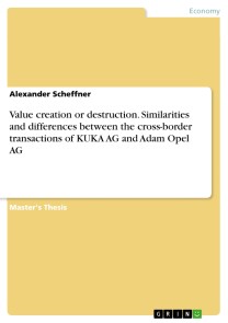 Master's Thesis from the year 2017 in the subject Business economics - Miscellaneous, grade: 1,0, International School of Management Dortmund , course: Mergers & Acquisitions, language: English, abstract: The global Mergers & Acquisitions (M&A) market has reached new all-time highs since the meltdown of the financial crisis in 2008. In 2015, the global M&A transaction volume reached its peak amounting to USD 4.7 trillion. While this way of strategic inorganic growth is often aimed at creating value to its shareholders and stakeholders respectively, the major concern of value creation using M&A remains. Recent studies testify a negative performance from the buyers’ perspective, as such as about 60% - 70% of all M&A transactions fail to generate value.Among others, the reasons include flawed valuation and thus overestimations of synergies and to unexpected high integration costs lead to value destruction. While these reasons hold true for domestic acquisitions and developed markets, there are further reasons for cross-border transactions, particularly for China, as Chinese buyer play an increasing role in worldwide M&A activities. Value destruction in such cross-border transactions is mostly associated with cultural differences, poor communications between the involved parties, lack of experience or local market know how.The findings suggest that the probability of value creation is higher if a buyer has broad experience in M&A activities, undertakes many small acquisitions, focus on cost reduction rather than growth motives and understands the market of the target company. The acquisitions of KUKA AG and Opel AG show many positive attributes, which lead to a higher probability of value creation. Beyond that, both companies are familiar with their targets and gained experience in acquisitions, which further reduce the factors that might lead of value destruction.