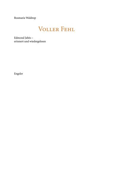 Edmond Jabès (1912-1991) gilt als einer der wichtigsten französischen Schriftsteller des 20. Jahrhunderts. Geboren in Kairo, ließ er sich in Frankreich nieder, nachdem er mit anderen Juden während der Suez-Krise 1956 aus Ägypten vertrieben wurde. Rosmarie Waldrop ist seine wichtigste englische Übersetzerin. Im Laufe ihrer langen Zusammenarbeit und Freundschaft mit Jabès entwickelte Waldrop ein sehr nuanciertes Verständnis für sein Werk, das wiederum ihre Entwicklung als Schriftstellerin und Übersetzerin beeinflusste. Voller Fehl ist ein Essay mit einem dreifachen Fokus: Er ist eine Erinnerung an Jabès, wie Waldrop ihn kannte, er ist sowohl eine Hommage an als auch eine Erläuterung von Jabès' Werk, und er ist eine Meditation über den Prozess des Übersetzens.