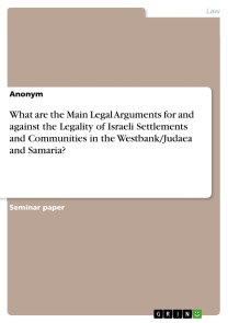 Seminar paper from the year 2021 in the subject Law - European and International Law, Intellectual Properties, grade: 1,3, , language: English, abstract: The years of discussion about the question of the legal status of the settlements already indicates that it is not easy to come up with a distinct answer. For this reason, this paper does not aim to provide a definitive determination of the legal status of the Israeli settlements/communities in West Bank/Judea and Samaria (= Occupied Palestinian Territory = OPT). Rather, the goal to examine the legal arguments put forward by the various parties to the conflict and other actors in this debate and to explain why it is so difficult to come to a clear answer. The first step will be a brief overview of the Israeli settlements/communities in general. Here I focus primarily on the critical aspects of the Israeli settlements/communities in order to make clear why they are so controversial. Then the arguments supporting illegality are presented. A distinction must be made here between the arguments based on the International Humanitarian Law and the arguments based on the International Human Rights Law. To continue with the other side, the arguments for the legality of settlements will be considered, in order to finally draw some conclusions in relation to the question.