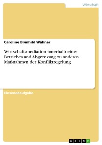 Einsendeaufgabe aus dem Jahr 2012 im Fachbereich BWL - Unternehmensführung, Management, Organisation, Note: 1,0, Hochschule Wismar (WINGS), Veranstaltung: Fernstudium, Sprache: Deutsch, Abstract: Diese Abschlussarbeit widmet sich den Vorteilen in der Wirtschaftsmediation (WM) als Maßnahme des sog. "Konfliktmanagements" innerhalb eines Betriebes und Abgrenzung zu anderen Maßnahmen der Konfliktregelung. Die WM zählt zum Oberbegriff "Konfliktmanagement". Darunter sind Maßnahmen zur Verhinderung einer Eskalation oder einer Ausbreitung eines, zum Beispiel bestehenden innerbetrieblichen oder -geschäftlichen Konflikts zu verstehen.Mediation findet in rechtlichen, organisatorischen und personellen Konflikten mehr und mehr Anwendung, so auch auf (inner-) betrieblicher oder (inner-)geschäftlicher Ebene von Unternehmen und Behörden. Sie dient in der Hauptsache, der Aufrechterhaltung der (inner-) betrieblichen und (inner-) geschäftlichen Beziehungen. Strittig ist, ob die WM an dieser Stelle sach- oder beziehungsorientiert verläuft, [...]. Die Ursache für innerbetriebliche/-behördliche Konflikte ist meist in einer gestörten Kommunikations- oder Arbeitsbeziehung der Streitparteien (Mitarbeiter, Teams, Abteilungen z.B. in Form von Mobbing; Vorgesetzten-Mitarbeiter-Konflikt; Betriebsrat und Unternehmensleitung) zu suchen. Aber auch Konflikte im Familienunternehmen, Fragen der Unternehmensnachfolge; Gesellschafterkonflikte oder Umstrukturierungsprozesse sind Ursachen für innerbetriebliche Konflikte. Beispiele für Beeinträchtigungen innerhalb eines Betriebes sind u.a. unangemessene Arbeitszuweisungen, Behinderungen der Arbeit, Verweigerung der Mitarbeit, Vorenthalten von Informationen, üble Nachrede, Verdächtigung, kränkende Kritik, Verweigerung der Loyalität, "Dienst nach Vorschrift", sexuelle Belästigung, Drohung mit Kündigung oder Mobbing. Ist der Konflikt auf der Beziehungsebene einmal entstanden, muss er auch auf dieser gelöst werden. Die Vorteile der WM an-sich sind mannigfaltig. [...] Ein Vorteil der sicherlich für die Unternehmensleitung von wesentlicher Bedeutung ist, liegt im Verfahren der Mediation selbst. Da sie vertraulich ist, droht kein Imageverlust für das Unternehmen. Ab einem Streitwert über 5000,- Euro kann zudem von einer wesentlichen Kosteneinsparung gesprochen werden. Sollte die WM scheitern wird im Streitfall der innerbetriebliche Konflikt vor dem ArbeitsrichterIn entschieden.