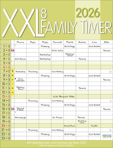 Mit acht Spalten zum Eintragen von Geburtstagen, Terminen und Erinnerungen bietet der Familienkalender XL viel Platz für Notizen . Damit ist es auch möglich mehrere Termine in einen Tag zu schreiben. Der Organisation des Alltags von großen und kleinen Familien steht somit nix mehr im Weg. Neben dem gesamten Kalenderjahrenthält der Wandplaner auch eine Vorschau bis März des Folgejahres.