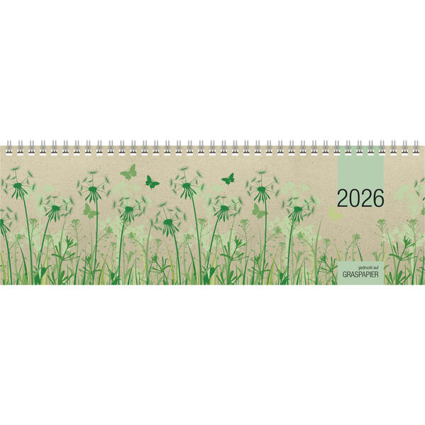 Der Zettler Tischquerkalender Graspapier 2026 kombiniert umweltfreundliche Materialien mit durchdachter Funktionalität. Gefertigt aus nachhaltigem Graspapier, bietet er eine angenehm rauere, leicht beschreibbare Oberfläche und ist ideal für eine zuverlässige Terminplanung im Büro, Homeoffice oder Alltag. - Nachhaltig & innovativ: Gefertigt aus Graspapier – ressourcenschonend, umweltfreundlich und mit einzigartiger Haptik - Übersichtliche Struktur: 1 Woche auf 2 Seiten mit Wochenzählung und praktischer Zweimonatsübersicht - Praktische Details: Stundeneinteilung von 8–20 Uhr – ideal für die Planung von Arbeitstagen, Terminen und Projekten - Benutzerfreundlich: 128 Seiten mit Drahtkammbindung, leicht umblätterbar und robust für den täglichen Einsatz - International einsetzbar: 4-sprachiges Kalendarium (DE/GB/FR/IT) – perfekt für internationale Teams oder Reisen - Format: 32 × 11 cm – handlich, platzsparend und doch großzügig für Notizen Mit dem Zettler Tischquerkalender Graspapier 2026 setzen Sie nicht nur auf klare Organisation, sondern auch auf nachhaltige Materialien – ein ökologischer und praktischer Begleiter für jeden Schreibtisch. Sprachen: Deutsch, Englisch, Französisch, Italienisch