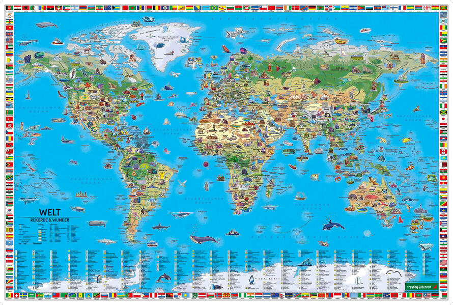 Schreibunterlage - Weltkarte für Kinder Informationen zur Schreibunterlage für Kinder - Kinderweltkarte - 500 Illustrationen mit Rekorden & Wundern - Rand mit Länderflaggen - Abwischbar und rutschfest - Format: 40,5 x 60,5 cm rutschfestenabwischbare