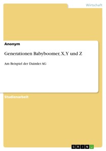 Studienarbeit aus dem Jahr 2019 im Fachbereich BWL - Allgemeines, Note: 1,3, Hochschule Aschaffenburg, Sprache: Deutsch, Abstract: Spätestens seit viele Babyboomer sich in Rente verabschiedet haben sind Unternehmen gezwungen sich auf die neuen Generationen vorzubereiten. Was sind ihre Ziele? Wie funktioniert die Generation Z und was ist ihre Motivation? Aber vor allem wie können alle Generationen miteinander arbeiten? Angelehnt an das Unternehmen Daimler, werden hier auf die Probleme und Lösungen eingegangen, um möglichst effizient und produktiv zu harmonieren.