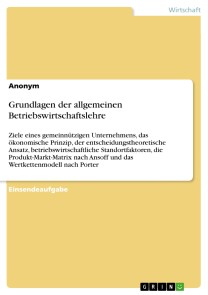 Einsendeaufgabe aus dem Jahr 2020 im Fachbereich BWL - Allgemeines, Note: 1,3, SRH Fernhochschule (SRH Riedlingen), Sprache: Deutsch, Abstract: Die folgende Einsendeaufgabe ist eine Sonderprüfung aus dem Modul "Allgemeine Betriebswirtschaftslehre" und erläutert folgende Themen: Illustration der Ziele eines konkreten öffentlichen oder gemeinnützigen Unternehmens und Darstellung der Ressourcen. Erläuterung des Grundgedankens des ökonomischen Prinzips und des entscheidungstheoretischen Ansatzes inklusive der Bedeutung formaler Entscheidungsmodelle. Systematisierung der betriebswirtschaftlichen Standortfaktoren. Erläuterung des Konzepts der Produkt-Markt-Matrix nach Ansoff und des Wertkettenmodells nach Michael Porter.