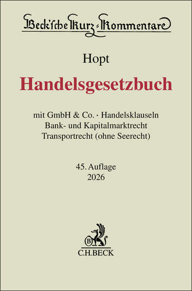 Zum Werk Dank seiner thematischen Spannweite und seines hervorragenden Preis-Leistungs-Verhältnisses ist der für die Praxis optimierte "Hopt" der beliebteste Wirtschaftsrechtskommentar seiner Klasse. Der jährliche Erscheinungsrhythmus bürgt für verlässliche Aktualität. Neben dem HGB sind im Kommentar folgende Gesetze und Regelwerke ganz oder teilweise abgedruckt und auch erläutert:EGHGB (Auszug)Lieferkettensorgfaltspflichtengesetz (LkSG)PartGGWG (Auszug)WPO (Auszug) mit AGB-WPFamFG (Auszug)HandelsregisterVOBGB (§§ 305-310, 705-740c)Incoterms® 2020KWG (§ 1 I-IIIe)AGB Banken, AGB Sparkassen mit SonderbedingungenERA 600®, eUCP®, ERI®, eURC®DepotG, BörsG (Auszug), WpPG (Auszug), VermAnlG (Auszug), MAR (Auszug), WpHG (Auszug)CMR-ÜbereinkommenSpediteurbedingungen - ADSp 2017 (Hinweise)Das Recht der Bankgeschäfte ist über die AGB-Erläuterungen hinaus in einem ca. 240-seitigen systematischen Abschnitt griffig dargestellt.Der "Hopt" ist das ideale Werk für den ersten Zugriff. Vorteile auf einen Blickalles im Griff: umfassende Mitberücksichtigung der praxiswichtigen NebengebieteErläuterung durch führende Expertenhochwertige ArgumentationshilfeSchwieriges wird klar auf den Punkt gebracht Zur NeuauflageDie 45. Auflage berücksichtigt neben einer Fülle neuer Rechtsprechung u.a. Änderungen des HGB, des WpHG, des BörsG und des VermAnlG durch das Finanzmarktdigitalisierungsgesetz (FinmadiG) sowie die geplante Umsetzung der CSRD-Richtlinie (Nachhaltigkeitsbericherstattung). Zielgruppe Für die Praxis des Wirtschaftsrechts, insbesondere Rechtsanwaltschaft, Steuerberatung, Wirtschaftsprüfung und Kaufleute.