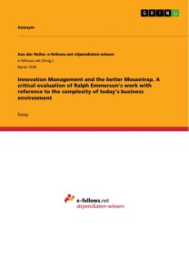 Essay from the year 2014 in the subject Economics - Innovation economics, grade: 81%, University Of Wales Institute, Cardiff, course: Innovation Management, language: English, abstract: “If a man can write a better book, preach a better sermon, or make a better mousetrap than his neighbour, though he build his house in the woods, the world will make a beaten path to his door.“This famous statement coined by Ralph Waldo Emerson (1855) circumscribes metaphorically that superior products will attract the costumers with no need of marketing or other involvement in order to sell. Irrespective of the inventor’s track of record or degree of popularity, people will hustle over to the inventor in order to buy the product.This report will critically evaluate the validity of Emerson’s statement especially taking into account the highly dynamic and complexity of today’s business environment. Moreover the process of innovation incorporating a close analysis in terms of types of inventions, implementation processes and the significance of entrepreneurship and technology transfer will be considered when evaluating Emerson’s statement.