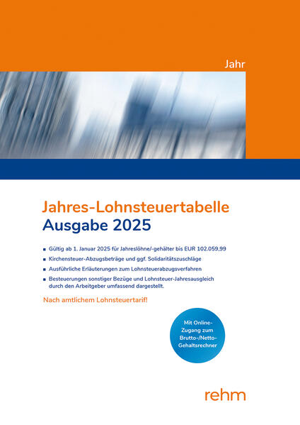 Die Rehm-Steuertabellen für 2025 berücksichtigen den neuen, mit Rückwirkung ab 1. Januar 2025 geltenden Tarif sowie alle steuerrelevanten Sozialversicherungs-Rechengrößen. Der Erläuterungsteil der Tabellen bietet praxisgerechte Arbeitshilfen zu den Themen steuerfreier Arbeitslohn, Pauschalierung der Lohnsteuer, Freibeträge und Hinzurechnungsbeträge im Lohnsteuerabzugsverfahren u.v.m.