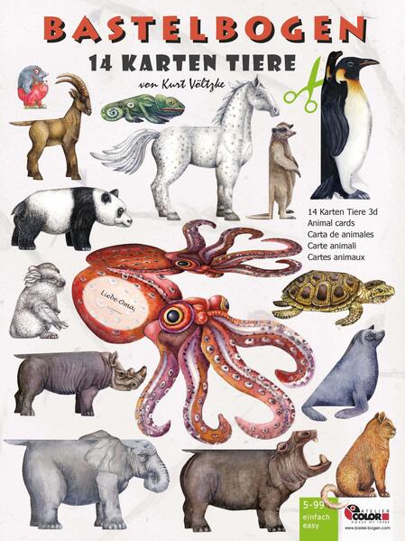 - Inhalt Bastelset Tiere: ein Bastelheft mit 7 Ausschneidebögen beidseitig bedruckt mit 14 Tieren, Erdmännchen, Oktopus, Koalabär, Geko, Elefant, Katze, Robbe, Nashorn, Nilpferd, Pinguin, Pandabär, Ziegenbock, Pferd und Schildkröte
