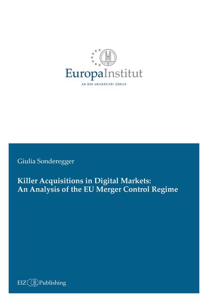 In her PhD thesis, Giulia Aurélie Sonderegger analyses killer acquisitions, which, in short, are acquisitions that aim to pre-empt potential future competition at an early stage. While this phenomenon was originally discovered in pharmaceutical markets, this thesis exclusively discusses killer acquisitions in the context of digital markets, thereby primarily focusing on the current European Merger Control Regulation (EUMR). The main research question is whether the EUMR is appropriate to tackle killer acquisitions occurring in digital markets, and if not, in what ways it needs to be amended to better address the challenges in the future. To tackle this question, the author assesses both the economic and legal effects of killer acquisitions on merger control in digital markets and, based on her findings, suggests amendments to the current European merger control regime. For a more comprehensive analysis, this thesis also includes an assessment of the recently enacted Digital Markets Act (DMA) to ascertain whether this regulation may serve as an additional tool to remedy such transactions.