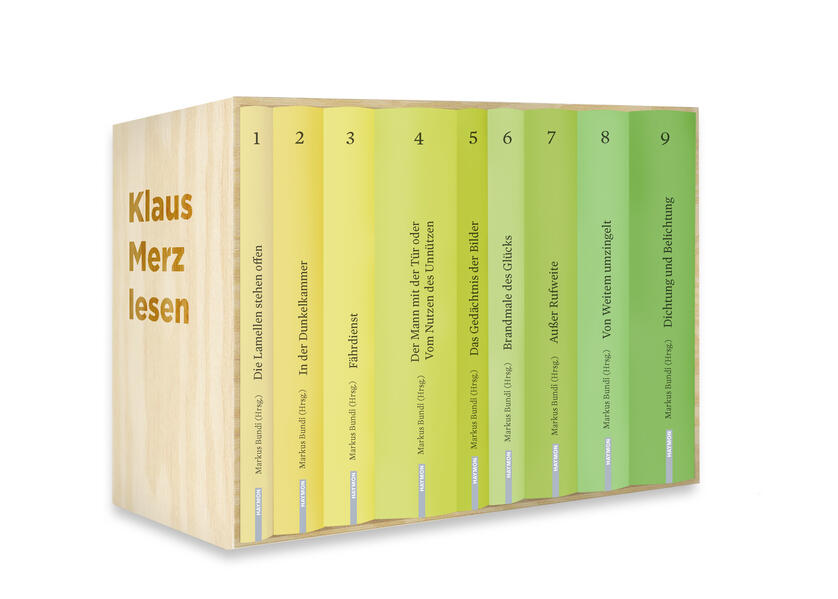 Die Kunst des Wesentlichen: das literarische Gesamtwerk von Klaus Merz Klaus Merz - eine herausragende Stimme der Gegenwartsliteratur Seit vielen Jahren gehört Klaus Merz zu den außerordentlichen und prägenden Stimmen der deutschsprachigen Gegenwartsliteratur. Seine zeitlose Prosa besticht ebenso wie seine präzise gearbeiteten Gedichte durch schlichte, klare Formulierungen, durch Vertrauen auf die leisen, eindringlichen Töne und durch einen untrüglichen Blick für das Wesentliche. Mehrfach wurde er sowohl für sein lyrisches als auch für sein erzählerisches Werk ausgezeichnet, zuletzt mit dem Schweizer Grand Prix Literatur 2024 für sein Gesamtwerk. Neun Bände im bibliophilen Holzschuber Die neunbändige Werkausgabe macht das literarische Schaffen von Klaus Merz versammelt zugänglich. Neben seinen bekanntesten Texten wie "Jakob schläft" oder "Der Argentinier" ermöglicht diese Werkausgabe auch die Begegnung mit zahlreichen Fundstücken und bisher unveröffentlichten Texten. Die neun Bände erlauben es, Entwicklungslinien im Werk von Klaus Merz nachzuzeichnen und die Grundprinzipien seiner Poetik zu erkennen, die von Anfang an erstaunlich deutlich angelegt sind. "Innenschau und sprachliche Verdichtung prägen das Werk von Klaus Merz. Mit dem Aargauer Autor wird eine eher leise, jedoch umso eindringlichere und gewichtige Stimme ausgezeichnet, die einen Echoraum weit über die Schweizer Grenzen hinaus findet." Schweizer Grand Prix Literatur 2024 Die Werkausgabe von Klaus Merz Die Lamellen stehen offen. Frühe Lyrik 1963-1991 In der Dunkelkammer. Frühe Prosa 1971-1982 Fährdienst. Prosa 1983-1995 Der Mann mit der Tür oder Vom Nutzen des Unnützen. Feuilletons Das Gedächtnis der Bilder. Texte zu Malerei und Fotografie Brandmale des Glücks. Prosa 1996-2014 Außer Rufweite. Lyrik 1992-2013 Von Weitem umzingelt. Prosa und Gedichte 2016-2023, Feuilletons 2012-2025 Dichtung und Belichtung. Materialienband zum Werk von Klaus Merz