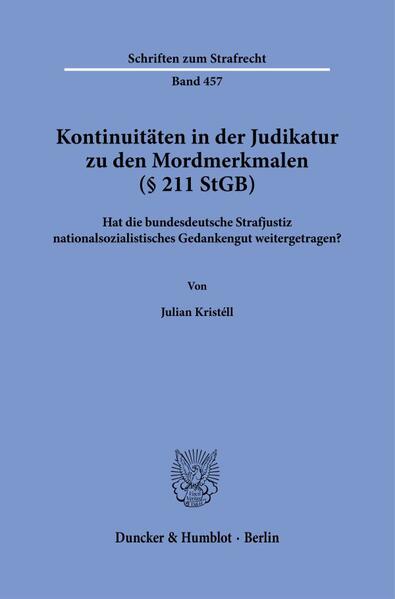 Kristéll, Julian'Murder Law and Nazi Legal Legacy: An Examination of the Murder Criteria in German Case Law (§ 211 German Criminal Code)': This study examines the case law on the murder provision (§ 211 StGB/German Criminal Code), introduced in 1941 and mainly unchanged to this day. It presents the origin and development of § 211 StGB and analyzes all Federal German rulings. The study shows that judicial decisions after 1945 and partly to this day remain influenced by Nazi ideology-characterized by linking law and morality and vague interpretations aimed at upholding material justice-through the application of the murder criteria.
