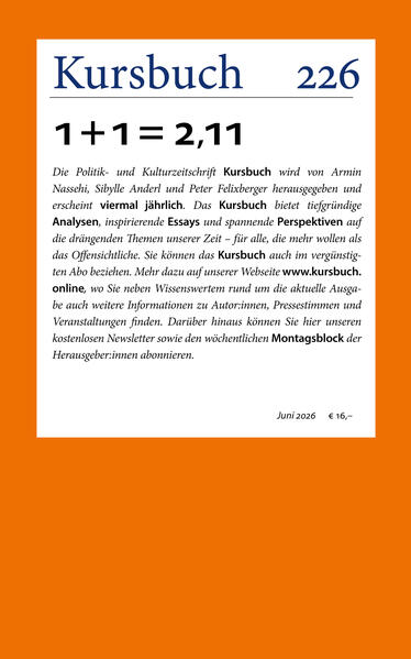 Die Politik- und Kulturzeitschrift Kursbuch wird von Armin Nassehi, Sibylle Anderl und Peter Felixberger herausgegeben und erscheint viermal jährlich. Das Kursbuch bietet tiefgründige Analysen, inspirierende Essays und spannende Perspektiven auf die drängenden Themen unserer Zeit - für alle, die mehr wollen als das Offensichtliche. Sie können das Kursbuch auch im vergünstigten Abo beziehen. Mehr dazu auf unserer Webseite www.kursbuch.online, wo Sie neben Wissenswertem rund um die aktuelle Ausgabe auch weitere Informationen zu Autor:innen, Pressestimmen und Veranstaltungen finden. Darüber hinaus können Sie hier unseren kostenlosen Newsletter sowie den wöchentlichen Montagsblock der Herausgeber:innen abonnieren.