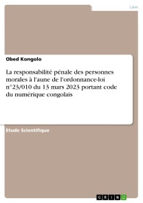 Obed KongoloEtude Scientifique de l’année 2023 dans le domaine Droit - Droit pénal , , langue: Français, résumé: La responsabilité pénale des personnes morales en droit congolais n'est pas démise de manière ordinaire. Elle est organisée particulièrement par certains textes juridiques à l'instar de l'ordonnanceloi n°23-010 du 13 Mars 2023 portant code du numérique congolais. Ainsi, cette étude tend à déterminer, dans le cadre de ce nouveau texte juridique, les personnes morales susceptibles d'engager leurs responsabilités pénales, les conditions de mise en jeu de cette responsabilité, les infractions dont ces dernières peuvent commettre, et en fin à épiloguer sur leur régime répressif. En plus de cela, dans le cadre de cette étude, nous avons pris le soin de faire quelques recommandations ou suggestions au législateur afin d'éclairer certains points obscurs que nous avons décelés dans le texte juridique susvisé.