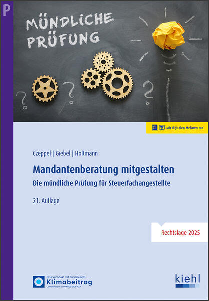 Fit für die neue mündliche Prüfung! Mit dieser völlig neu konzipierten Auflage bereiten Sie sich optimal auf die mündliche Abschlussprüfung zur/zum Steuerfachangestellten vor. Im Mittelpunkt stehen realitätsnahe Prüfungsfälle, die dem Ablauf der echten mündlichen Prüfung nachempfunden sind. So können Sie unter authentischen Bedingungen üben und Ihre Präsentations- und Gesprächskompetenz gezielt trainieren. Der erste Teil des Buches vermittelt Ihnen alle wichtigen Informationen zum Prüfungsablauf, gibt wertvolle Tipps für den "großen Tag" und stellt praktische Checklisten bereit. Im zweiten Teil erwarten Sie zahlreiche Übungsfälle aus allen relevanten Themenbereichen - ideal, um die geforderte strukturierte Darstellung von Lösungswegen und Ergebnissen zu verinnerlichen. Als besonderes Plus erhalten Sie Zugang zu einem ergänzenden Online-Training, das die wichtigsten fachlichen Inhalte noch einmal abfragt und Ihr Wissen festigt. Mit diesem Buch sind Sie bestens vorbereitet - für eine erfolgreiche mündliche Prüfung und einen souveränen Auftritt! Rechtslage: 2025. Der Print-Titel enthält einen Freischaltcode für die Online-Version des Buches. Alternativ ist die Online-Version auch separat erhältlich. Inhaltsverzeichnis: Teil 1: Allgemeine Infos zur Prüfung Teil 2: Übungsfälle zur Prüfungsvorbereitung Teil 3: Lösungen zu den Übungsfällen Anhang: Ideen für Mind-Maps Vorlage Vorbereitungszeit Checkliste für den Prüfungstag Ideen für Lernkarteikarten¿