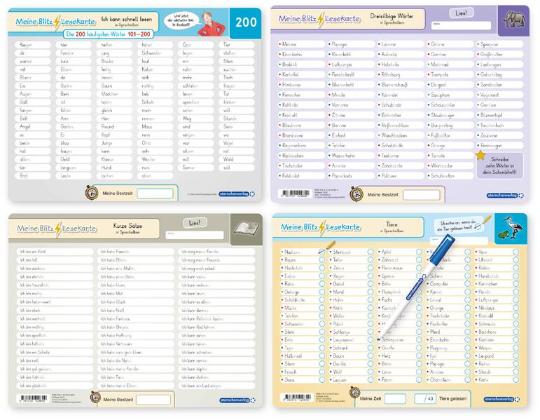 Die Kinder erlernen bei diesen 4 Blitzlesekarten für die 1. bis 3. Klasse das zügige und genaue Lesen. Jeweils 60 Wörter mit 24 Themenwörtern beinhaltet die Lernvorlage. Durch konzentriertes Lesen auf der ersten Seite soll das Kind die richtigen Wörter anstreichen. Am Ende kann das Kind immer wieder seine Bestzeit und die Anzahl der gefundenen Suchwörter in die vorgesehenen Felder eintragen. Themen: 1. Karte: Ich kann schnell lesen - Die 200 häufigsten Wörter 2. Karte: Dreisilbige Wörter / Sehr lange Wörter 3. Karte: Kurze Sätze 4. Karte: Tiere / Obst, Gemüse Wiederbeschreibbar - langlebig - trocken abwischbar - erprobt Tafel im großen Format 32,5 x 25 cm (Vorder- und Rückseite) mit Stift