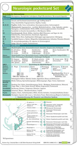 Nerven bewahren! Alle wichtigen Informationen, die man in der Neurologie täglich braucht - und immer wieder nachschlagen muss: - Neurologische Untersuchung und Zusatzdiagnostik; - Überblick über Hirnnerven, Kennmuskeln, Neuroanatomie und Gefäßversorgung; - Wichtige, klinisch relevante Tests und Skalen; - 4. Extrakarte mit Arm- und Beinnerven, Dermatomen und sensibler Innervation.