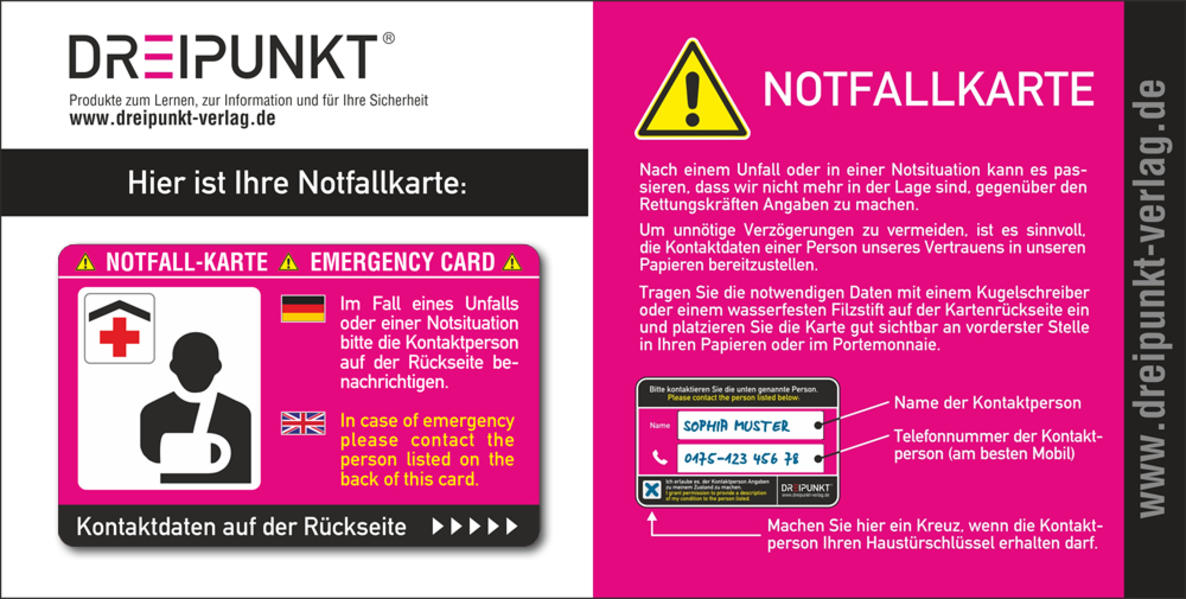 Bei einem Unfall oder einem medizinischen Notfall ist es wichtig, dass eine Kontaktperson für Polizei oder Rettungsdienste erreichbar ist. Diese scheckkartengroße Notfallkarte hat Platz in Ihren Papieren oder in der Brieftasche. Dies sind die Orte, an denen Rettungsdienste nach Kontaktdaten suchen, gerade wenn das Smartphone gesichert, defekt oder nicht greifbar ist. Tragen Sie die Daten der Kontaktperson ein, die sich bei einem Notfall um Ihre Angelegenheiten kümmern kann! Neben den Kontaktdaten können Sie in einem Ankreuzfeld festlegen, ob der Kontaktperson den Haustürschlüssel ausgehändigt werden darf. Mit dieser Notfallkarte stellen Sie sicher, dass die richtige Kontaktperson schnell und unkompliziert erreicht werden kann.