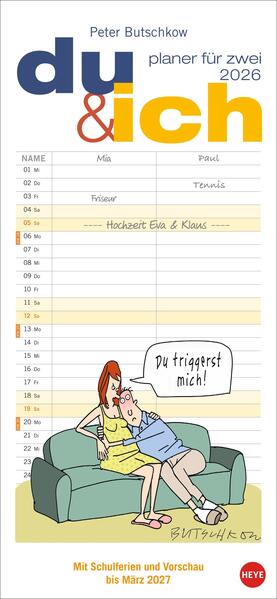 - Der Peter-Butschkow-Kalender für Paare, die ihre Termine mit Witz und Augenzwinkern koordinieren - Paarkalender mit Humor: Die Zeichnungem des beliebten Karikaturisten zeigen den Pärchenalltag von seiner ehrlichen Seite - Macht die Planung zum Vergnügen: Das Kalenderformat 16 x 34,7 cm bietet viel Platz für Eintragungen und für Butschkows witzige Cartoons - Komplett mit Schulferien und Vorschau bis März 2027: Der Kalender für zwei, der Organisation zum Kinderspiel macht - Gemeinsam planen und die Zeit zu zweit genießen: das gelingt mit den Partnerplanern von Heye im Athesia Kalenderverlag