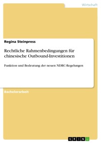 Bachelorarbeit aus dem Jahr 2019 im Fachbereich BWL - Wirtschaftspolitik, Note: 1,0, Universität zu Köln, Sprache: Deutsch, Abstract: Im Rahmen dieser Abschlussarbeit soll beantwortet werden, welche Änderungen die neuen NDRC-Regelungen mit sich bringen und welche Auswirkungen diese auf die chinesischen Outbound-Investitionen haben. Dafür werden die rechtlichen Rahmenbedingungen für die Überprüfung von chinesischen Outbound-Investitionen zunächst vorgestellt. In diesem Kontext werden anhand einer Analyse der Änderungen die Funktion und die Bedeutung der NDRC-Regelungen abgeleitet.Im Laufe dieser Abschlussarbeit wird auch aufgezeigt werden, inwiefern die neuen NDRC- Regelungen mit der Belt and Road-Strategie verknüpft sind und ob sich daraus eine Instrumentalisierung der Outbound-Investitionen für makroökonomische Ziele ergeben kann. Dafür werden zunächst die bisherigen Entwicklungen der chinesischen Outbound-Investitionen im Zusammenhang mit politischen Zielsetzungen betrachtet. Nach der Vorstellung der zuständigen Regierungsbehörden und der relevanten Richtlinien für die Überprüfung von Outbound-Investitionen werden die neuen Regelungen der NDRC unter Bezugnahme auf die bedeutendsten Änderungen veranschaulicht. Im Anschluss werden die Änderungen hinsichtlich ihrer möglichen Auswirkungen auf chinesische Outbound-Investitionen betrachtet. Das Fazit dieser Abschlussarbeit fasst zusammen, welche Funktion die neuen NDRC- Regelungen, in den Kontext rechtlicher Rahmenbedingungen für chinesische Outbound-Investitionen gesetzt, für die Entwicklung der Outbound-Investitionen haben werden.Laut der jüngsten Prognose des Weltwirtschaftsforums werden die Outbound-Investitionen chinesischer Unternehmen in den nächsten zehn Jahren 2,5 Billionen USD erreichen. Angesichts der Tatsache, dass das Outbound-Investmentvolumen im Jahr 2016 ein Rekordhoch von 196,2 Mrd. USD erreicht hat, im Folgejahr 2017 jedoch wieder auf 120 Mrd. USD gesunken ist, stellt sich die Frage, welche Faktoren diese Entwicklungen beeinflusst haben. Für eine bessere Einschätzung des Einflusses der rechtlichen Rahmenbedingungen auf chinesische Outbound-Investitionen bedarf es einer genaueren Betrachtung. Eine wesentliche Rolle für das Regulierungssystem Chinas für Outbound-Investitionen spielt dabei die Staatliche Kommission für Entwicklung und Reform (National Development and Reform Commission, kurz: NDRC), die zum 1.3.2018 neue Regelungen für chinesische Outbound- Investitionen eingeführt hat.