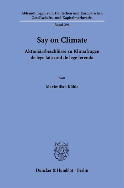 'Say on Climate Shareholder Resolutions on Climate Issues de lege lata and de lege ferenda': The question of a 'say on climate' only superficially examines the possibility of shareholders in German stock corporations expressing their views on climate transformation issues through a resolution at the annual general meeting. Underlying this is the fundamental issue of corporate law concerning the 'correct' distribution of powers within a stock corporation. The thesis renegotiates this issue in relation to climate transformation and simultaneously provides a proposal for regulation.