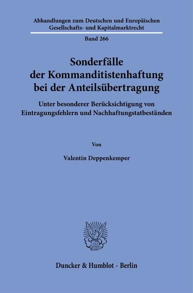 'Special Cases of Limited Partner Liability on Transfer of Shares. With Particular Consideration of Registration Errors and Subsequent Liability': The thesis examines special cases of limited partners' liability on transfer of shares, in which unsolved liability issues and risks arise. Main topics are the analysis of the legal consequences resulting from registration errors and the extent to which the purchaser of a share assumes the liability position of the seller. Further, it examines the effects of the legal amendments introduced by the Act to Modernize Partnership Law (MoPeG) and the resulting new legal issues.