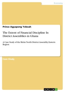 Research Paper (postgraduate) from the year 2014 in the subject Business economics - Economic Policy, Kwame Nkrumah University of Science and Technology (UNIVERSITY), course: BUSINESS ADMINISTRATION, language: English, abstract: Decentralization is a mechanism for bringing governance closer to the governed and helps to improve public administration by empowering local authorities, thereby enhancing the capacity of government to achieve local participation and accelerated development through financial sanity. Section 240(2) (c) of the Local Government Act of Ghana provides that each district assembly shall have a sound financial base with adequate and reliable sources of revenue, hence making them financially accountable to the people they serve. Despite this requirement, many Metropolitan/Municipal/District Assemblies have a limited number of sources of revenue for carrying out their activities. Apart from the District Assemblies Common Fund (DACF), which is 7% of total national tax revenue, the assemblies can also receive grants, land rates, mineral royalties, transfer, ceded revenues and external credits. The use of these monies is expected to conform to the Ministry of Finance and Economic Planning requirements. It is a requirement that, all monies are released at the assembly level by a warrant. This research examined the extent to which financial discipline was concerned within the Birim North District Assembly. It was found that not all monies paid were on the authority of the warrant. They are also expected to engage in activities that can generate revenues, (Internally Generated Fund, IGF) to be used for their administrative and other recurrent operations. However, many of them lack the capacity to develop revenue generating activities while others are unable to generate sufficient revenue internally because of the deprived circumstance of their districts. The researcher also found out that there were a lot of loopholes in the management of finances in the Local Government Service if the case of the Birim North District Assembly is anything to go by, only by the assumption that, this accession is not a hasty generalization. This research envisages providing baseline contribution to sound financial management within the district assemblies of Ghana.