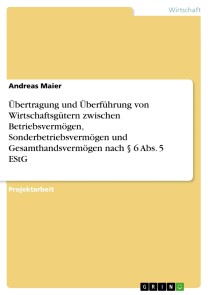 Andreas MaierProjektarbeit aus dem Jahr 2014 im Fachbereich BWL - Rechnungswesen, Bilanzierung, Steuern, Duale Hochschule Baden-Württemberg, Villingen-Schwenningen, früher: Berufsakademie Villingen-Schwenningen, Sprache: Deutsch, Abstract: Der Gesetzgeber bietet mit § 6 Abs. 5 EStG die Möglichkeit zur Reorganisation und Umstrukturierung von PersGes, indem einzelne WGs unter gewissen Voraussetzungen steuerneutral zum BW übertragen bzw. überführt werden können.Die Darstellung der Übertragungs- und Überführungswege von WGs zw. BV, SBV und GHV im Rahmen des § 6 Abs. 5 EStG ist Gegenstand dieser Projektarbeit. Damit die Vorschriften des § 6 Abs. 5 EStG nicht missbraucht werden, gibt der Fiskus bestimmte Einschränkungen vor, die es zu beachten gilt. Diese einschränkenden Vorschriften sind in § 6 Abs. 5 Satz. 4 bis 6 niedergeschrieben und werden im Rahmen der Projektarbeit näher beleuchtet.Dass die Grenzen der begünstigten Übertragung nach § 6 Abs. 5 EStG nicht einheitlich ausgelegt werden, zeigt ein aktuell bestehender Disput zw. dem I. und IV Senat des BFH hinsichtlich des Transfers einzelner WGs zw. SchwesterPersGes. Diese Meinungsunterschiede, sowie die möglichen Ausgänge der Diskussion, werden im Rahmen der Arbeit aufgezeigt.Abschließend wird auf die in jüngster Zeit diskutierte Fragestellung, ob im Rahmen des § 6 Abs. 5 EStG bei teilentgeltlichen Übertragungen die sog. „strenge Trennungstheorie“ oder die „modifizierte Trennungstheorie“ anzuwenden ist, eingegangen. Auch hier ist sich die Rechtsprechung nicht einig. Es folgt die Gegenüberstellung der Argumentationen des X. Senats und des IV. Senats in Bezug auf die Anwendung der „strengen Trennungstheorie“ und der „modifizierten Trennungstheorie“ bei teilentgeltlichen Übertragungen. Die einzelnen Auswirkungen der beiden Theorien werden anhand eines Beispiels abschließend dargestellt.
