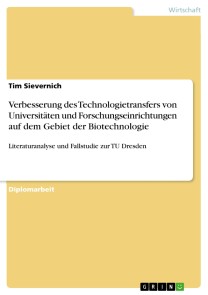 Tim SievernichDiplomarbeit aus dem Jahr 2009 im Fachbereich BWL - Allgemeines, Note: 1,9, Technische Universität Dresden (SAP Stiftungslehrstuhl für Entrepreneurship und Innovation), Sprache: Deutsch, Abstract: Die Biotechnologiebrache hat für die Region Dresden in den letzten Jahren stetig an Bedeutung gewonnen. Dies war durch den Einsatz von Fördermitteln möglich, mit deren Hilfe die verstärkte Errichtung von Forschungsinfrastruktur auf diesem Gebiet finanziert wurde. Die Folge dieser Politik war die Ansiedlung und Gründung einer Vielzahl kleiner und mittlerer Biotech-Unternehmen sowie Zulieferern. Im Rahmen dieser Arbeit wird eine umfassende Literaturanalyse zum Thema Effizienz und Effektivität von Technologietransfers durchgeführt. Darauf aufbauend finden Experteninterviews mit Beteiligten des Biotechnologietransfers an der Technischen Universität Dresden statt. Das Ziel ist die Erarbeitung von Handlungsempfehlungen, auf deren Basis der Biotechnologietransfer an der Technischen Universität Dresden verbessert und resultierend daraus der Biotechnologie-Standort Dresden weiter gefestigt werden kann.
