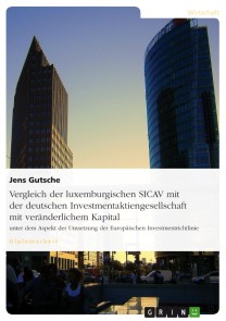 Jens GutscheDiplomarbeit aus dem Jahr 2007 im Fachbereich BWL - Bank, Börse, Versicherung, Note: 2,0, Fachhochschule Trier - Hochschule für Wirtschaft, Technik und Gestaltung, Sprache: Deutsch, Abstract: Die vorliegende Arbeit betrachtet die in 1.2 geschilderte Problemstellung überwiegend aus der Sicht der deutschen Investmentbranche. Aus diesem Grunde orientieren sich insbesondere die konzeptionellen Grundlagen, welche in Kapitel 2 dargelegt werden, primär an den deutschen Vorschriften. Im Anschluss an die Begriffseinführungen und dem Überblick der grundlegenden Konzepte des Investmentgeschäftes werden die rechtlich-regulatorischen Rahmenvorgaben der Europäischen Union hinsichtlich des Investmentgeschäftes näher betrachtet. In den Kapiteln 4 und 5 werden danach die jeweiligen nationalen Umsetzungsvorschriften der EU- Vorgaben in Deutschland und Luxemburg dargelegt. Die jeweils gebildeten nationalen Rechtsrahmen, als Basis der betreffenden gesellschaftsrechtlichen Form, werden danach im Detail auf die existierenden Vorgaben und Anforderungen untersucht. Dabei sind die Kapitalanforderungen, die Gründungsmodalitäten, die Anlagevorschriften und die Auflagen für den laufenden Geschäftsbetrieb für den Vergleich relevant. Abschließend werden die so gewonnenen Erkenntnisse gegenübergestellt und miteinander verglichen.