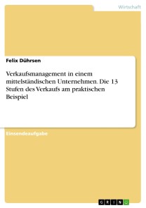Felix DührsenEinsendeaufgabe aus dem Jahr 2017 im Fachbereich BWL - Sonstiges, Note: 1,2, Deutsche Hochschule für Prävention und Gesundheitsmanagement GmbH, Sprache: Deutsch, Abstract: In dieser Einsendeaufgabe werden die 13 Stufen des Verkaufes anhand eines praktischen Beispiels erläutert.Dazu erfolgt zunächst eine Analyse der Verkaufssituation des Unternehmens bevor sich eine Untersuchung der Kundenorientierung des Betriebes anschließt.Anschließend wird der Aspekt der Motivation und der Mitarbeiterführung, besonders der Aspekt der Teamentwicklung betrachtet.Um ein umfassendes Bild des Unternehmens abzubilden wird dann in einem letzten Schritt eine genaue Analyse der Kennenzahlen des Unternehmens vorgenommen.
