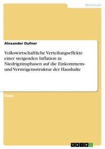 Alexander DufnerEssay aus dem Jahr 2022 im Fachbereich VWL - Sonstiges, , Sprache: Deutsch, Abstract: Ziel des Essay ist die kritische Betrachtung der Volkswirtschaftlichen Effekte einer steigenden Inflation bei niedrigen Zinsen auf die Einkommens- und Vermögensstruktur der Haushalte. Aufgrund der expansiven Geldpolitik (FED, EZB), den ökonomischen Folgewirkungen der Corona Pandemie – vor allem gekennzeichnet durch Lieferengpässe und gestörter Produktionsprozesse, sind Gesellschaften rund um die Welt mit hohen Preissteigerungen konfrontiert, welche über einen langen Zeitraum so nicht zu verzeichnen waren. Erhebliche Verteuerungen von Rohstoffen und Energie aufgrund der Ukrainekrise wirken indes wie ein Brandbeschleuniger auf die Inflation. Diese Gemengelage stellt einen makroökonomischen Angebotsschock dar. Die daraus resultierenden Kostenbelastungen für Wirtschaft, den öffentlichen Sektor, als auch Privathaushalte erklären die hohen Inflationsraten. Höhere Inflationsraten beeinflussen generell die Kaufkraft der Haushalte, sowie die Einkommen und Vermögen. Konsum- und Vermögensstrukturen verändern sich. Zusätzliche Transaktionskosten werden den Konsumenten abverlangt. Hohe Preissteigerungen führen zu Verteilungseffekten u.a. durch verzögerte Anpassungen von Löhnen oder der Zinsen. Zudem wirkt die Inflation bis in die Staatshaushalte hinein, da über die Steuerwirkung und Progression eine entsprechende Umverteilung stattfindet.