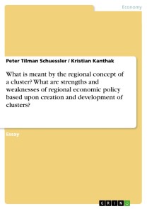 Essay from the year 2002 in the subject Economics - Micro-economics, grade: 16 of 20, University of St Andrews (Economics Department), course: Regional Economics, language: English, abstract: Clusters can be motors for regions. They are supposed to reduce unemployment, ensure growth and wealth. This essay will discuss the question critically whether regional economic policy is able to create and enforce those new industrial districts. The limited extent of this text forces us to describe the topic nearly without examples; it is also not possible to mention all theoretical approaches in depths, it was rather just necessary to combine different ideas (e.g. in the definition part).It will be shown that there is still a lot of academic work to be done until the phenomenon of regional cluster will be utterly understood. Nevertheless it will become clear that the strength of the policy is that there are many possibilities to affect the growth and evolution of clusters. Yet, most of them have several weaknesses to be thought of.Due to the fact that most clusters have been created or came into existence throughout decades, a change in policy makers` minds will be necessary. They have to accept that building up successful clusters is not possible within a short term perspective.