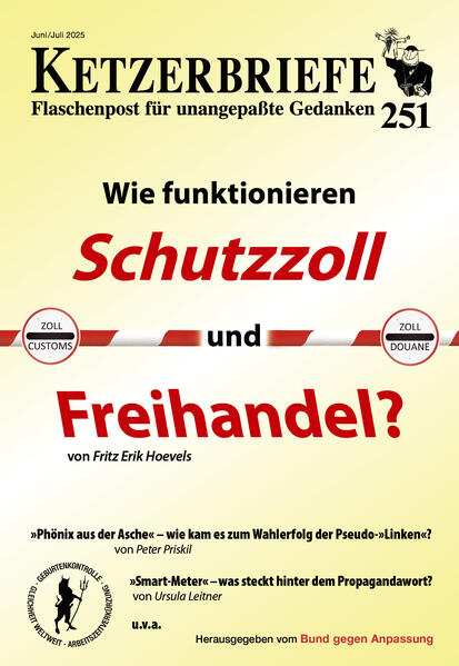 Aus dem inhalt Wie funktionieren Schutzzoll und Freihandel? von Fritz Erik Hoevels Volksvertreter oder Volkszertreter? Die Kartellparteien und ihre 'Brandmauer' 'Phönix aus der Asche' - wie kam es zum Wahlerfolg der Pseudo-'Linken'? von Peter Priskil Hexenjagd auf kleine Hexen von Claudia Michelitz Katharer? - Hat es nie gegeben! Rezension: Markus Krumm u.a., Die Erfindung der Katharer von Peter Priskil Das Hafttagebuch von Kurt Hättasch Was ist los in Rumänien? Teil 3 von Beate Skalée & Michail Rodinescu 'Smart-Meter' - was steckt hinter dem Propagandawort? von Ursula Leitner Buchmesse Leipzig: Schikanen und Lügen hinter den Kulissen Leserzuschrift: Wußten Sie das?