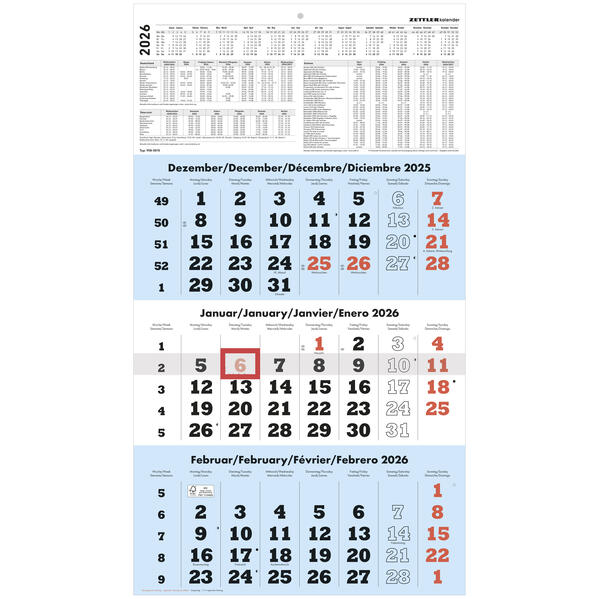 Der Zettler 3-Monatskalender blau 2026 ist der praktische Mehrmonatsplaner für Büro und Homeoffice. Mit großem Kalendarium, zusätzlicher Kopftafel und integriertem Datumsschieber behalten Sie Ihre Termine immer im Blick. - Kalendertyp: 3-Monatskalender (blau) - Übersichtliches Kalendarium: 3 Monate pro Blatt, mit hervorgehobenen Sonn- und Feiertagen, Wochenzählung - Zusatzinformationen: Mit Mondphasen, Ferienterminen und integrierter Jahresübersicht - Praktische Details: Überstehende Rückwand mit 15 cm großer Kopftafel, am Kopf geheftet und perforiert, mit Datumsschieber - Design: 12 Blatt, Druck in Schwarz/Rot/Blau, Farbkombination Hellblau/Weiß - Sprachvielfalt: Mehrsprachiges Kalendarium (DE/EN/FR/ES) - Format & Ausstattung: 33 × 59 cm, FSC-zertifiziert Mit dem Zettler 3-Monatskalender blau 2026 organisieren Sie Ihre Termine übersichtlich, funktional und umweltfreundlich – ein zuverlässiger Begleiter für jeden Arbeitstag. Sprachen: Deutsch, Englisch, Französisch, Italienisch