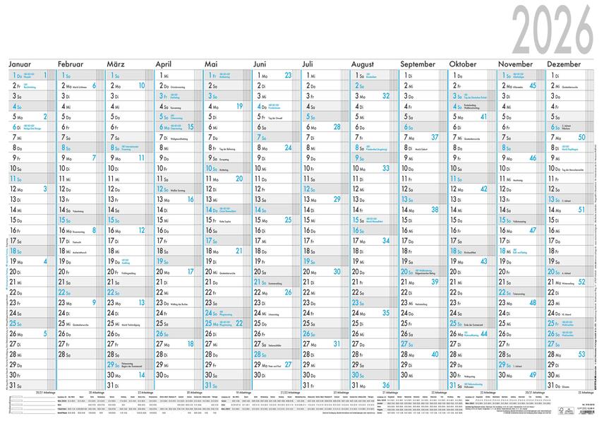 Plakatkalender im Format 100 x 70 cm, 12 Monate/ 1 Seite, 5 Spalten zur Markierung von Urlaubstagen, Tages-, Wochen- und Arbeitstagezählung, Ferientermine, Druck schwarz/blau, Kalendarium deutsch, 5 Stück gerollt